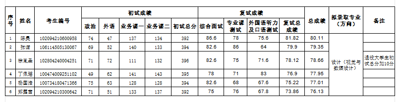备注:复试成绩(满分100分)=综合面试×50%+专业课测试×30%+外语听力及口语测试×20%;总成绩(满分100分)=(初试成绩/5)×50%+复试成绩×50%。