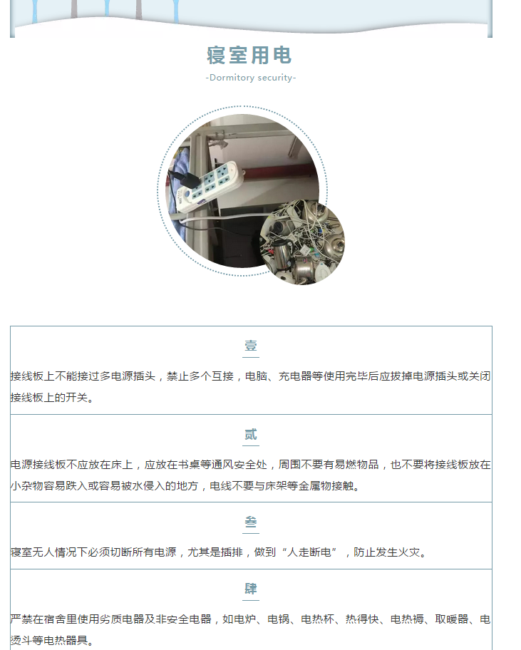 秋冬季节天气寒冷干燥,是火灾的多发季节。在这里要提醒各位同学们一定要注意宿舍安全。宿舍是我们共同的家,安全则是这个家的重中之重。