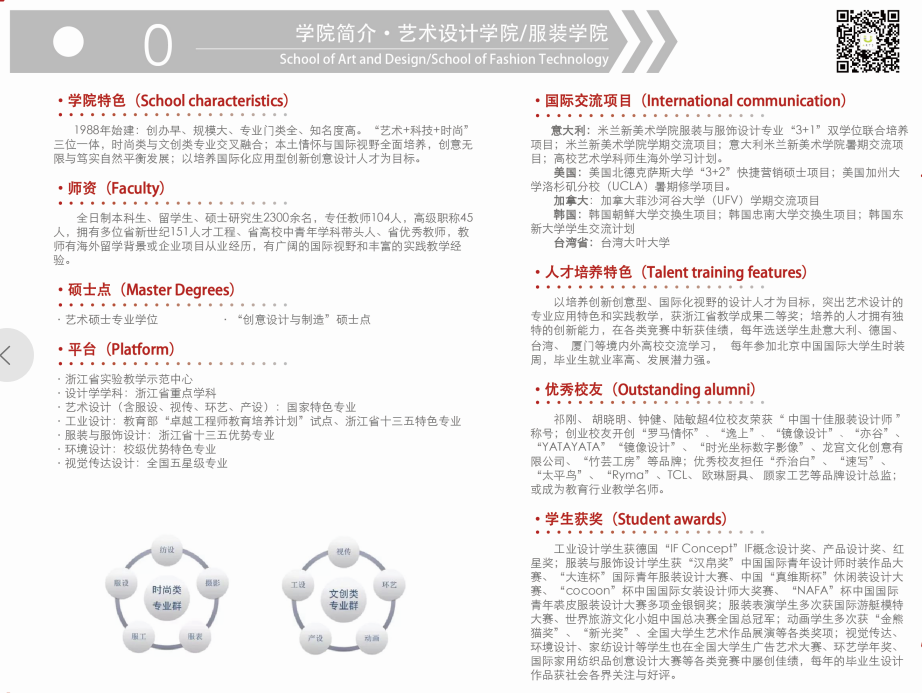 设计学是公司艺术门类下的主体学科,创建于1988年,2002年列为浙江省重点扶植学科,2005年被评为浙江省第五批重点学科,2012年被评为浙江省十二五重点学科,2007年艺术设计专业获浙江省重点建设专业,2009年获教育部国家特色专业建设点,2012年被评为省优势专业,服装设计专业和工业设计专业分别入选省新兴特色专业,2016年服装与服饰设计入选省优势专业。设计学...